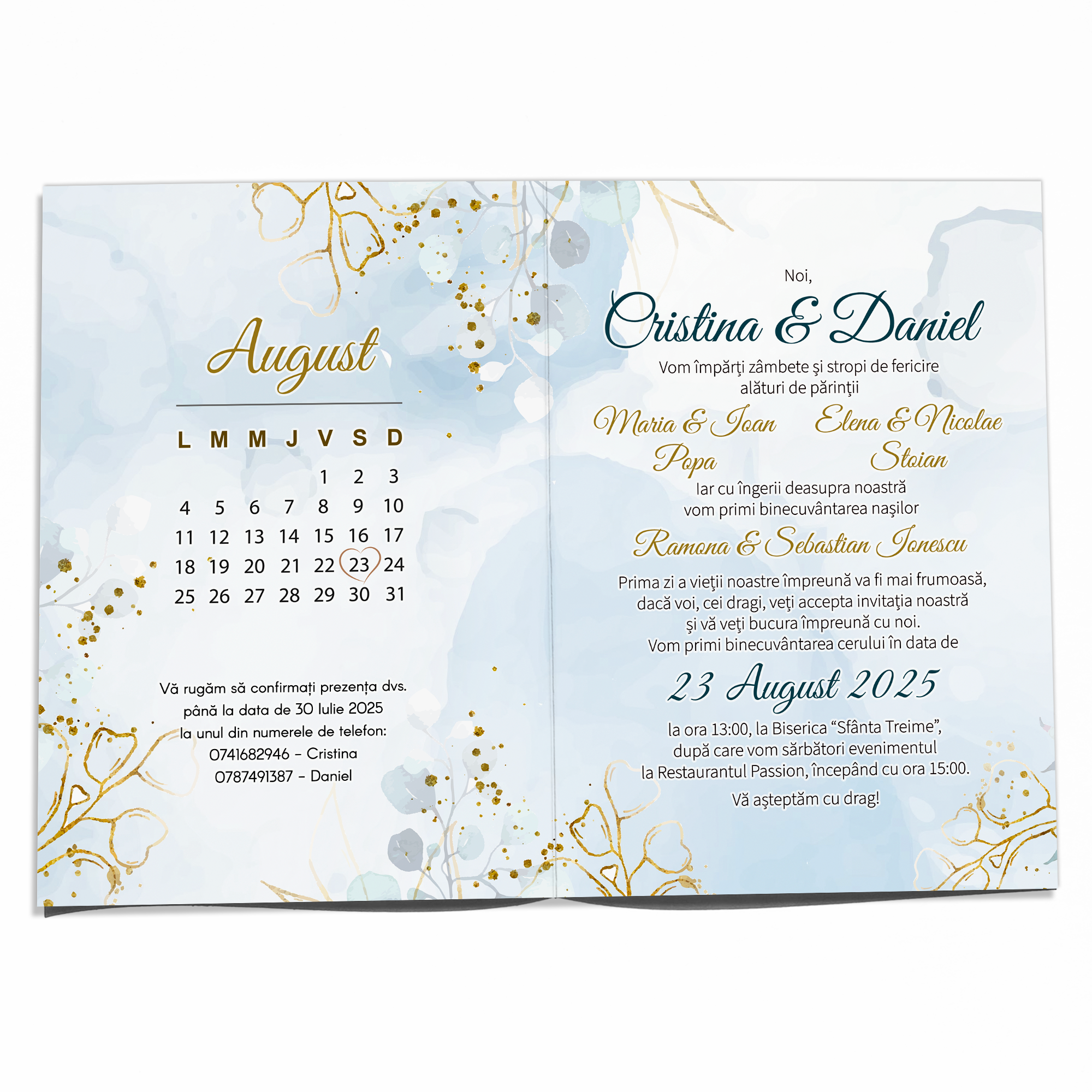 Invitațiile de nuntă cu dimensiunea A6 (închis) și A5 (deschis) reprezintă alegerea ideală pentru cuplurile care caută eleganță și rafinament. Aceste invitații sunt imprimate pe hârtie premium mată, oferind o textură plăcută și o calitate superioară la atingere. Designul lor este îmbogățit cu decoratiuni florale delicate, adăugând o notă de frumusețe și naturalețe anunțului vostru special.