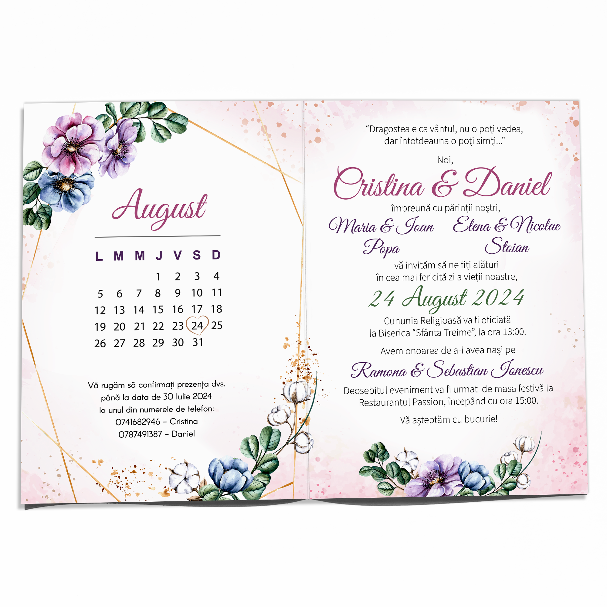 Fiecare invitație este concepută pentru a impresiona, combinând tradiția cu un strop de modernitate. Florile, atent alese pentru design, simbolizează dragostea și unitatea, creând o atmosferă romantică și caldă. Dimensiunile invitațiilor permit includerea tuturor informațiilor necesare, fără a compromite aspectul elegant și ordonat.