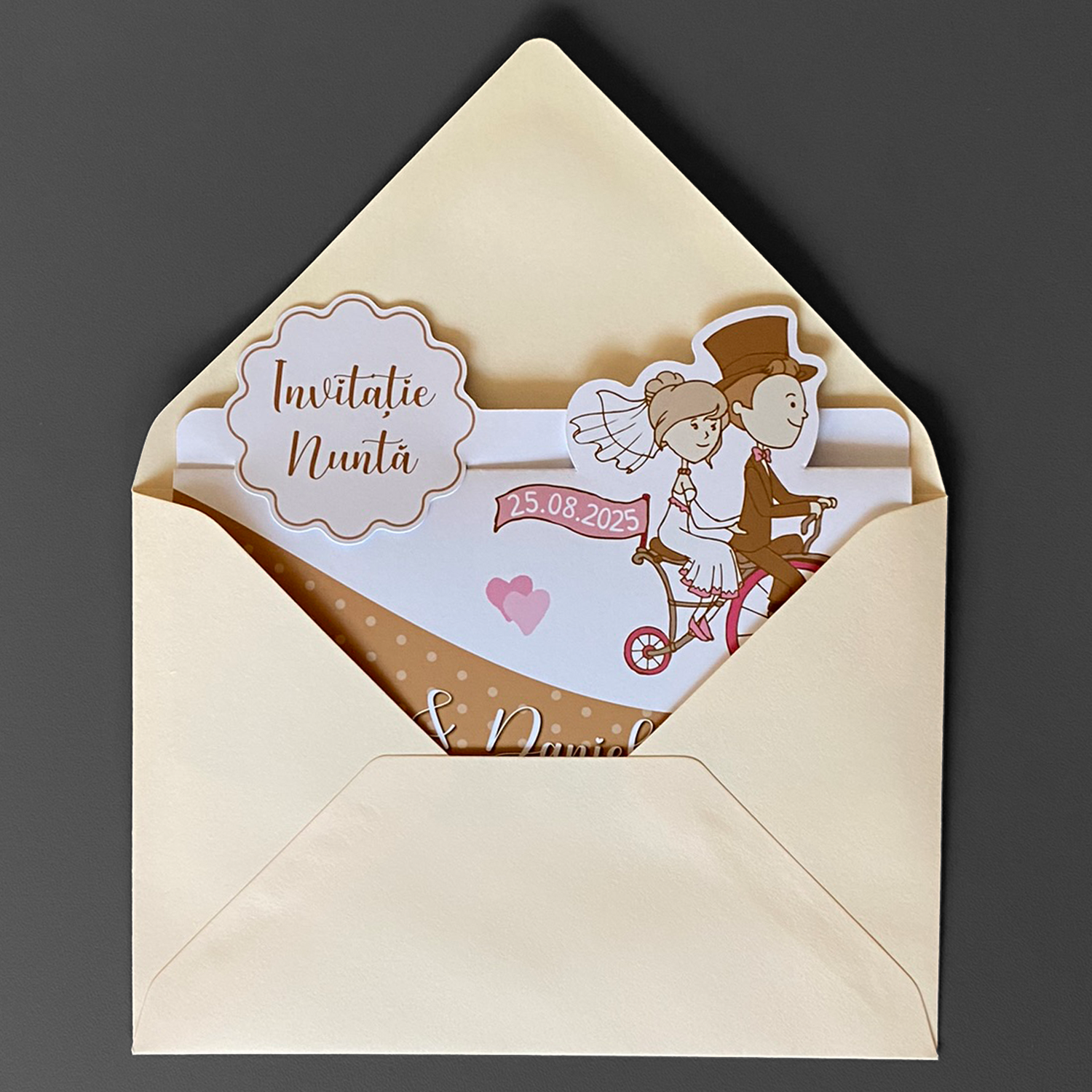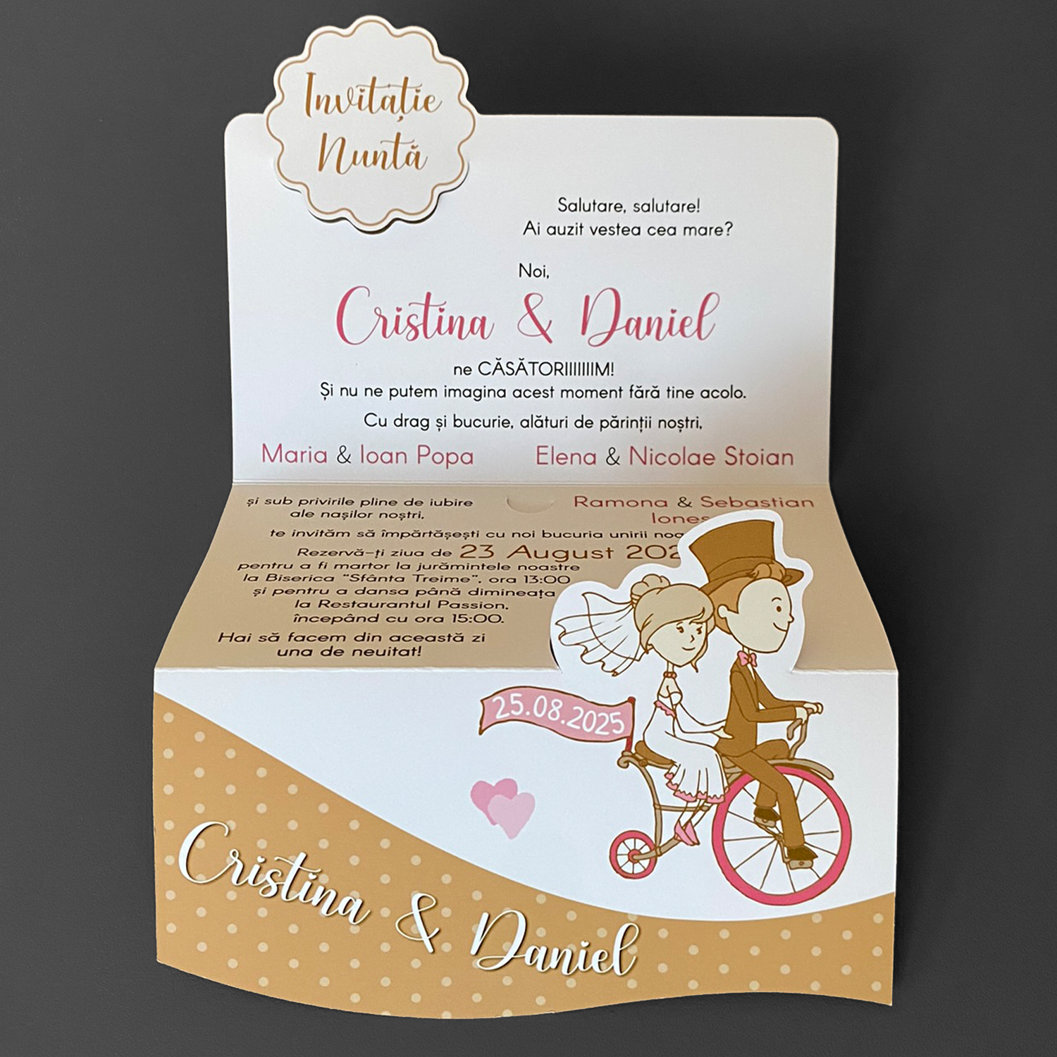 Aceste invitații elegante decupate prezintă un design încântător cu mire și mireasă pedalând împreună pe o bicicletă, simbolizând parcursul comun în noua lor viață. Realizate din hârtie mată de calitate premium, aceste invitații aduc un plus de rafinament oricărui anunț de nuntă. Textura mată a hârtiei asigură o scriere ușoară și clară, permițând culorilor și detaliilor designului să iasă în evidență fără reflexii deranjante. Decupajul fin și detaliat al cuplului pe bicicletă este realizat cu o precizie remarcabilă, creând o imagine vie și emoționantă care va impresiona cu siguranță invitații. Aceste invitații nu sunt doar un simplu anunț, ci o prezentare artistică a iubirii și unității, făcând fiecare invitat să se simtă special și parte din ceva cu adevărat unic. Fiecare invitație este o operă de artă în sine, promițând să adauge o notă personală și memorabilă oricărei nunți.