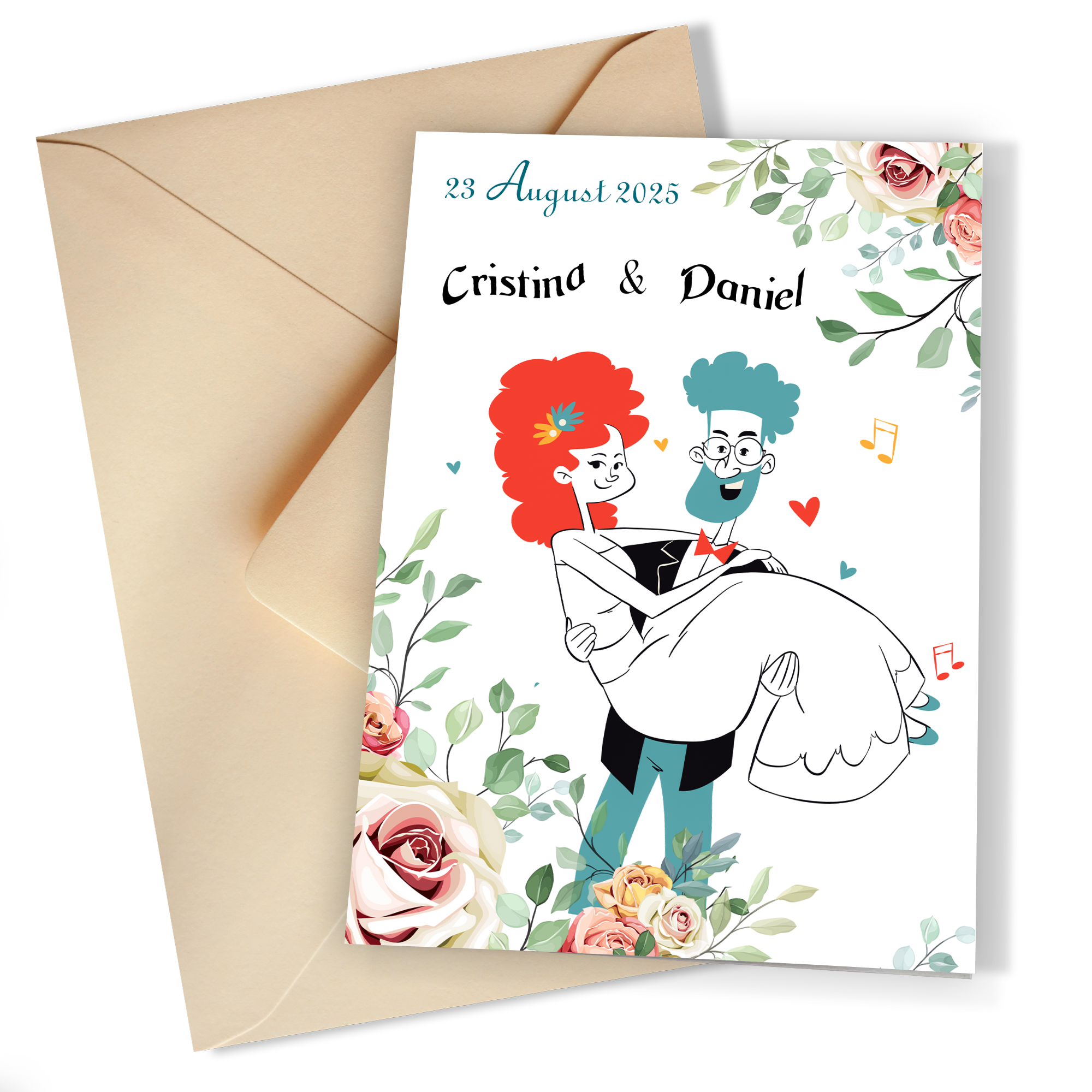 Invitațiile de nuntă haioase sunt perfecte pentru cuplurile care doresc să iasă din tipare. Ilustrațiile amuzante ale mirilor, pline de caracter și culoare, captează esența unei zile pline de bucurie și distracție. Fiecare detaliu este gândit să aducă zâmbete pe fețele oaspeților, pregătindu-i pentru o ceremonie neconvențională.